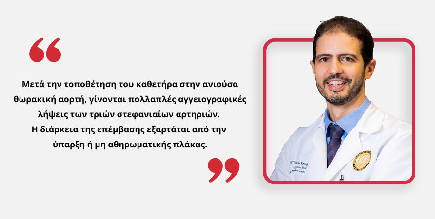 Η προσπέλαση από την κερκιδική αρτηρία, αλλά και τη μηριαία αρτηρία, γίνεται με υπερηχογραφική καθοδήγηση, που αποτελεί άλλο ένα μέτρο ενίσχυσης της ασφάλειας του ασθενούς, αφού επιτρέπει την οπτική επιβεβαίωση παρακέντησης της αρτηρίας με ένα τσίμπημα και αποτρέπει τις πολλαπλές προσπάθειες και τη δημιουργία αιματώματος ή τραυματισμού της αρτηρίας και των παρακείμενων ιστών. Μετά την τοποθέτηση του καθετήρα στην ανιούσα θωρακική αορτή, γίνονται πολλαπλές αγγειογραφικές λήψεις των τριών στεφανιαίων αρτηριών. Η διάρκεια της επέμβασης εξαρτάται από την ύπαρξη ή μη αθηρωματικής πλάκας. Αν δεν υπάρχουν αθηρωματικές στενώσεις, η επέμβαση διαρκεί περίπου 45 λεπτά, ο καθετήρας απομακρύνεται και στην κερκιδική αρτηρία τοποθετείται περίδεση αιμόστασης. Αν βρεθούν σημαντικές αιμοδυναμικά στενώσεις, τότε ο διαγνωστικός καθετήρας απομακρύνεται και στη θέση του τοποθετείται καθετήρας αγγειοπλαστικής, μέσω του οποίου πραγματοποιείται η τοποθέτηση stent. Τότε η διάρκεια της επέμβασης είναι περίπου 90 λεπτά.